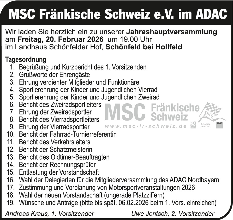 Unser herzlicher Dank gilt allen Vereinsmitgliedern, Aktiven, Unterstützern, Sponsoren, Funktionären, Helferinnen und Helfern, Teilnehmer sowie unseren treuen Fans, die uns im vergangenen Jahr mit großem Engagement, Vertrauen und Begeisterung begleitet haben. Ohne euch wären die zahlreichen Veranstaltungen und Aktivitäten nicht möglich gewesen – vom Jugendkartslalom, über unsere Rallye-Veranstaltungen, die Helfereinsätze bei befreundeten Vereinen bis hin zu den vielen Vereinsveranstaltungen, die unser Miteinander so besonders machen.